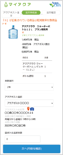 ご注文本数、受け取りを希望されるアクアポスト、空ボトル返却本数をご入力いただき、ご注文を確定します。
