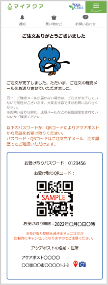 マイアクアの注文完了画面もしくは、注文履歴、注文完了メールに記載のお受け取りパスワード又はQRコードをご確認ください。